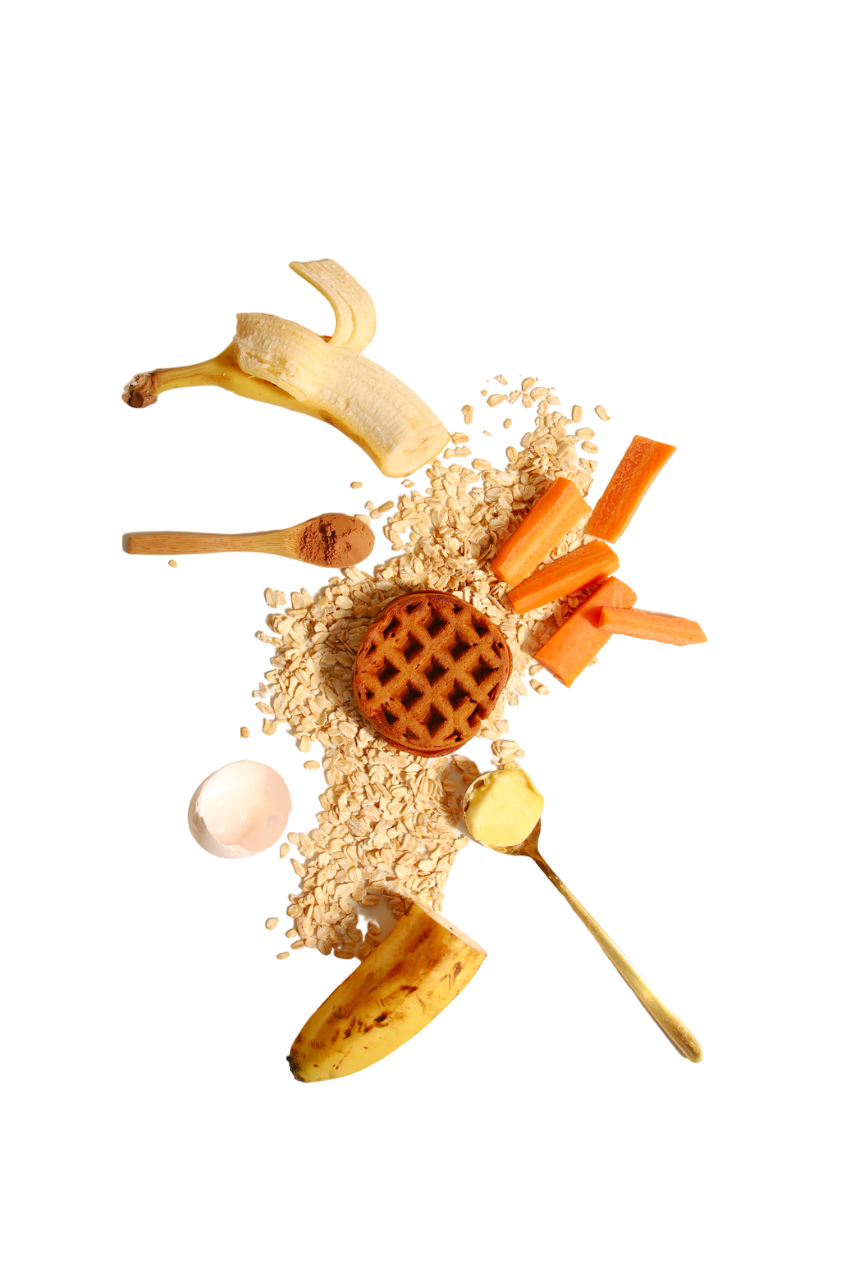 Zanahoria, clara de huevo, harina de avena, cacao en polvo orgánico, plátano, ghee (mantequilla clarificada), extracto de vainilla, sal.